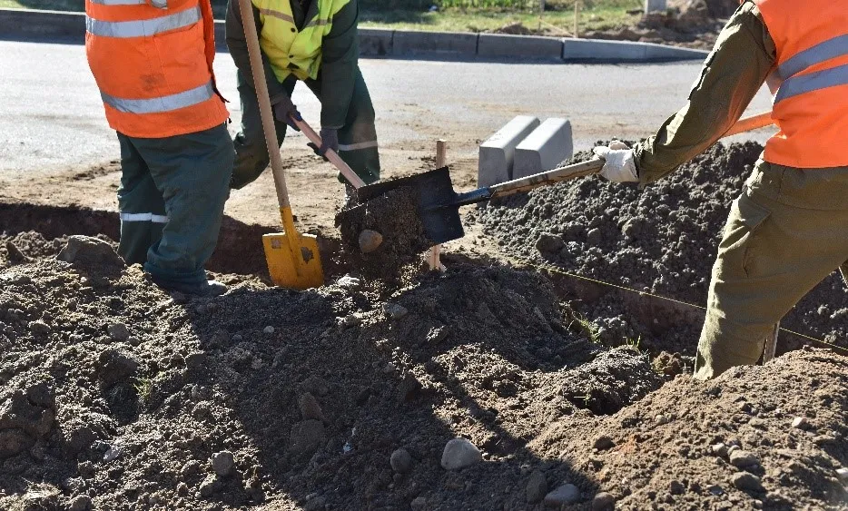 Workers in safety vests excavating ground with shovels at a construction site.